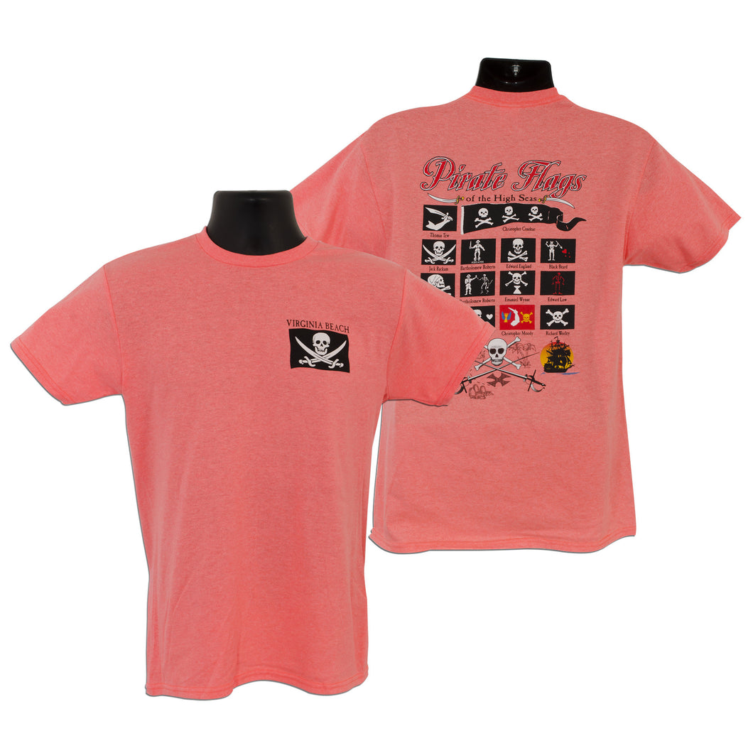 This tee in coral heather color with assorted pirate flags makes a cool souvenir gift from Virginia Beach. Available in five colors.
